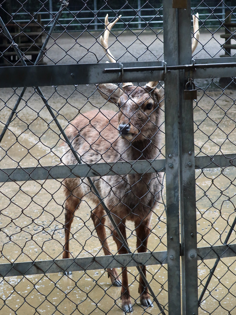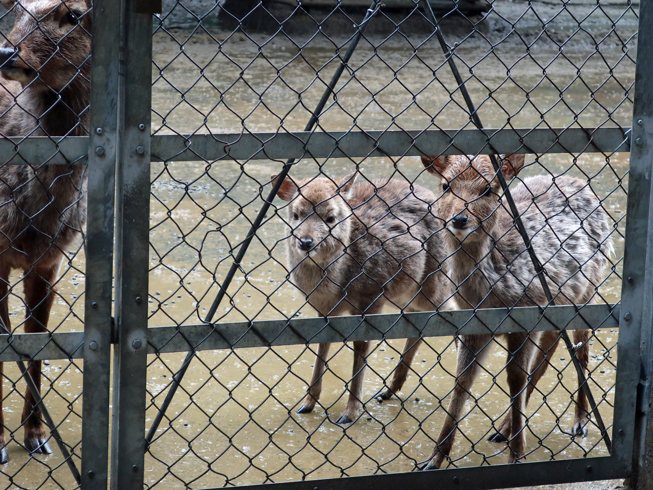 雨に濡れてクアッカワラビーみたいな顔になっちゃってる子鹿たちも一生懸命見つめている。