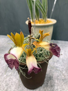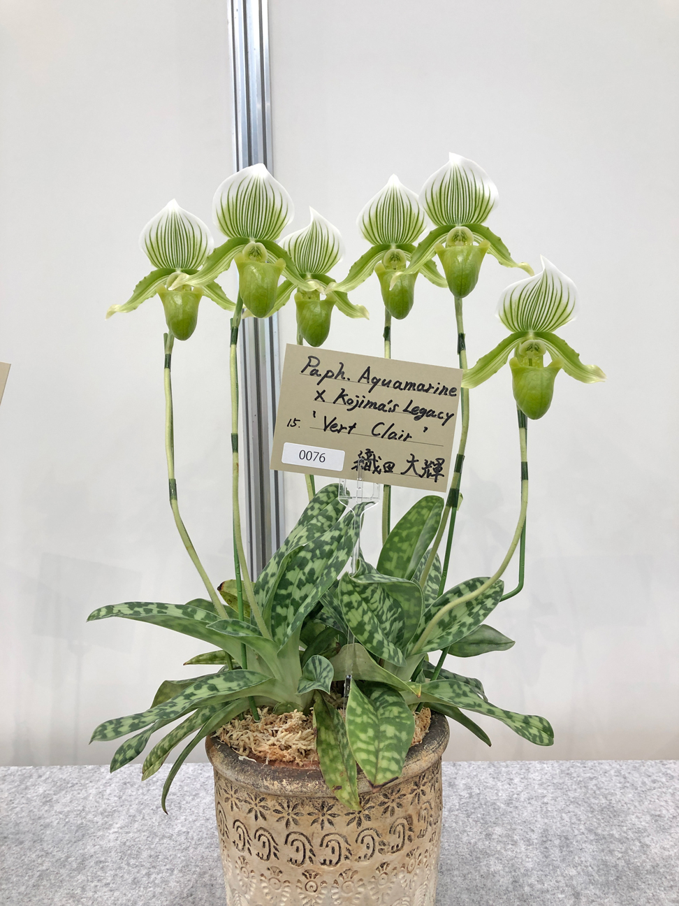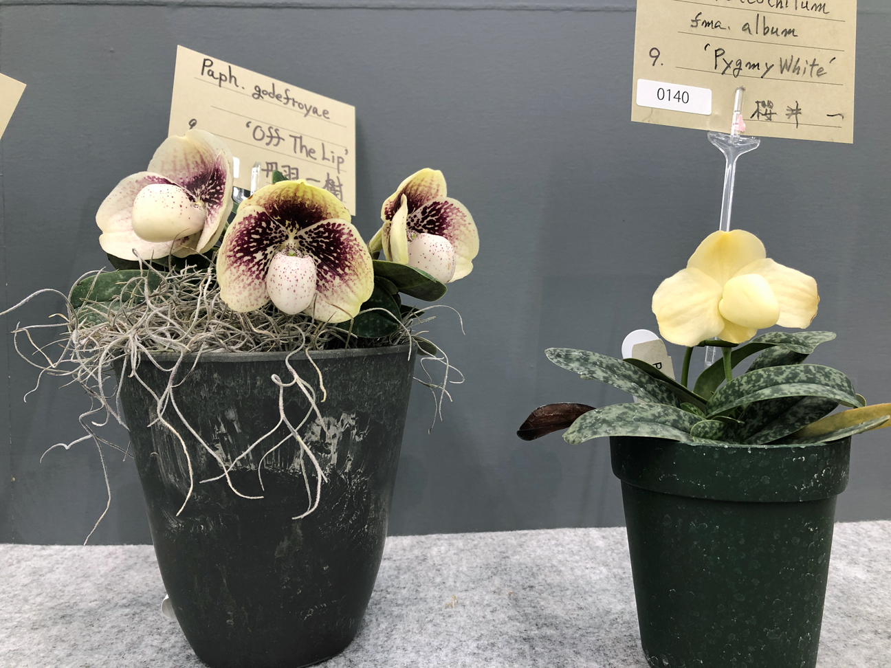 パフィオは葉が大きくて花茎がとっても長く伸びるので、我が家の狭いスペースでは育てられないのだが、これならなんとかなりそう。