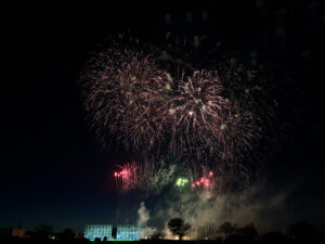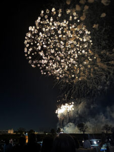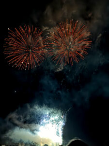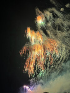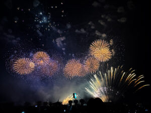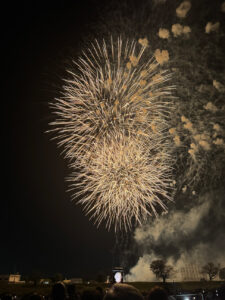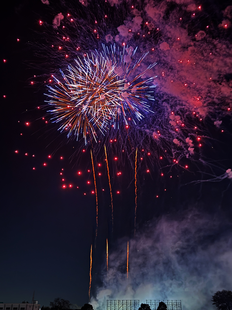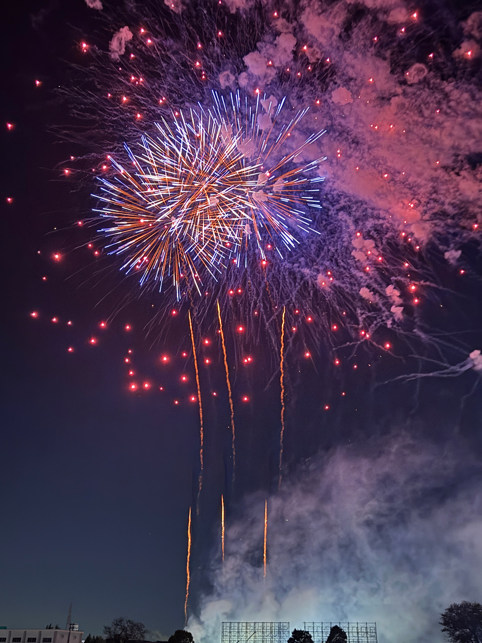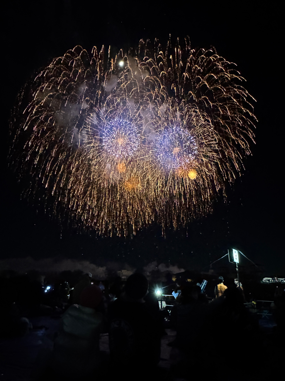 実はこの後も、スターマイン中に多分落ちた火の粉が次の番の花火の筒に入っちゃったか何かで、順番でもないのにいきなり打ち上がっちゃうというアクシデントがあった。