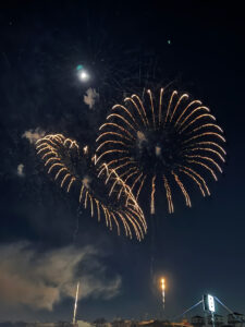 最後の方は、丁度花火が開くあたりに月がかかってきて、月との共演になっていた。