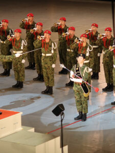 第1師団の音楽隊とらっぱ隊。制服ではなく迷彩服なのは、らっぱが日常と結びついたものだからかな?
