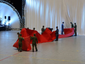 ちょっとがっかりしながら席を立ったら、隅っこであのブルーインパルス横断幕を畳んでいた。