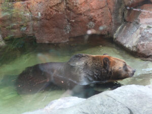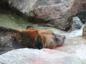 水の中で伸びてたヒグマ。こうやって遠くから見るとかわいいんだけど、遠くからでも桁違いにデカいのが分かるので絶対に対峙したくないと思う。