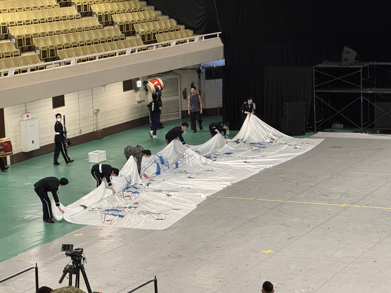 ちょっとがっかりしながら席を立ったら、隅っこであのブルーインパルス横断幕を畳んでいた。