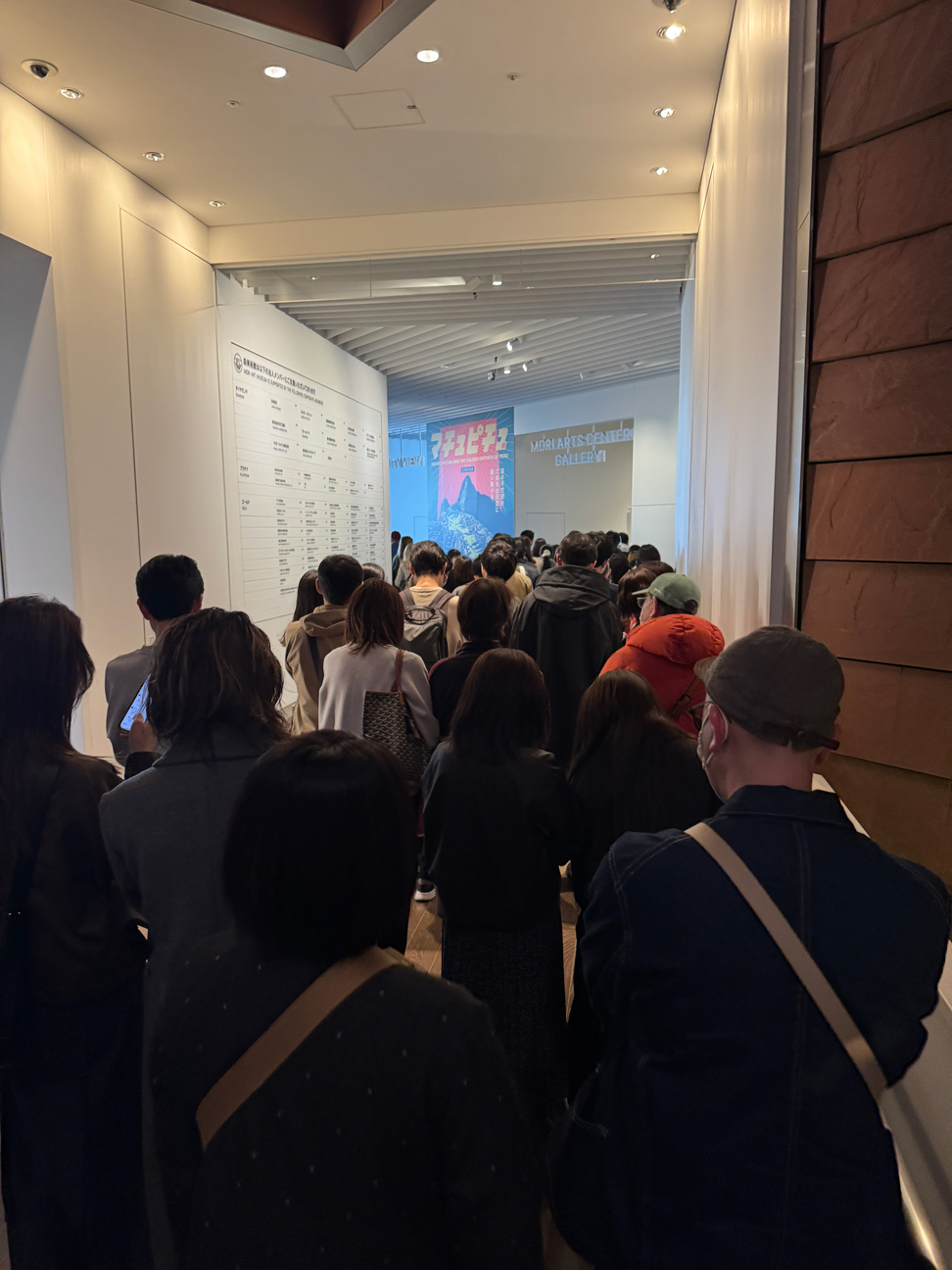 入って分かったのだが、入口を入ってすぐの所に展示の概要を4分ほどの映像で紹介する巨大スクリーンがあって、しかも通路の構造的にスルーしづらいため、そこで人が滞留してしまっているのだった。