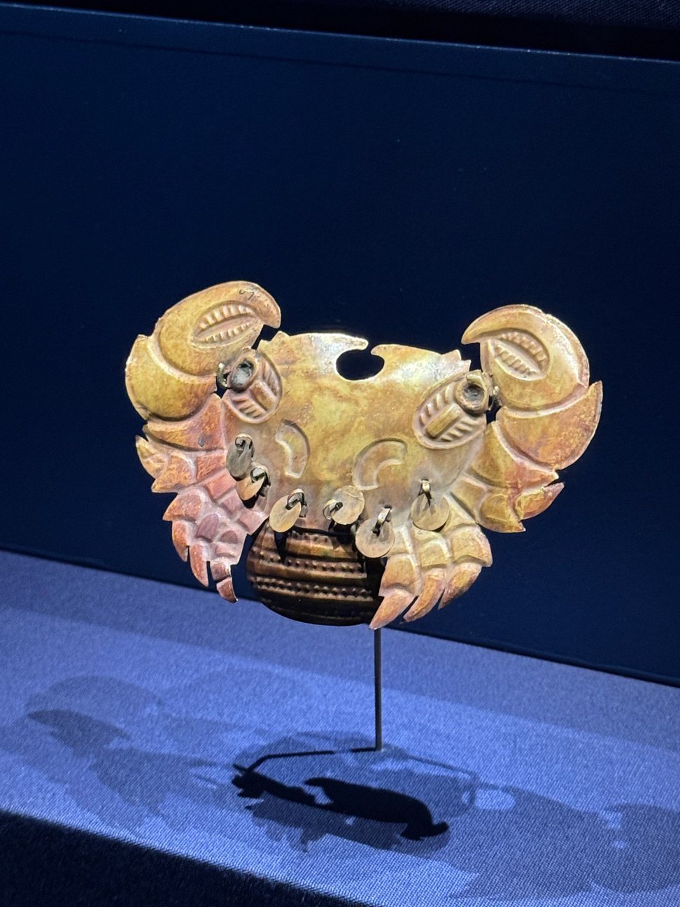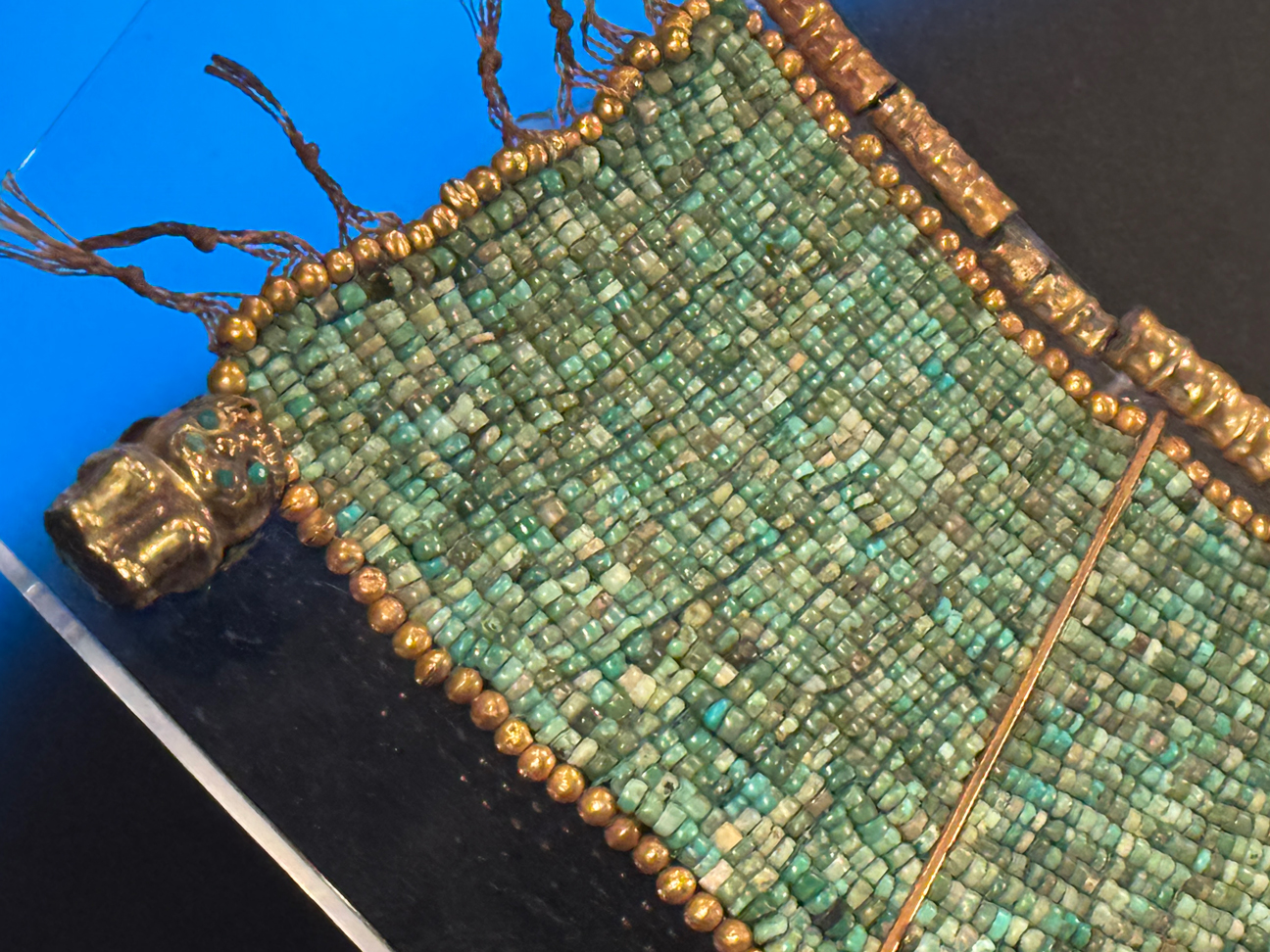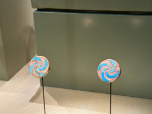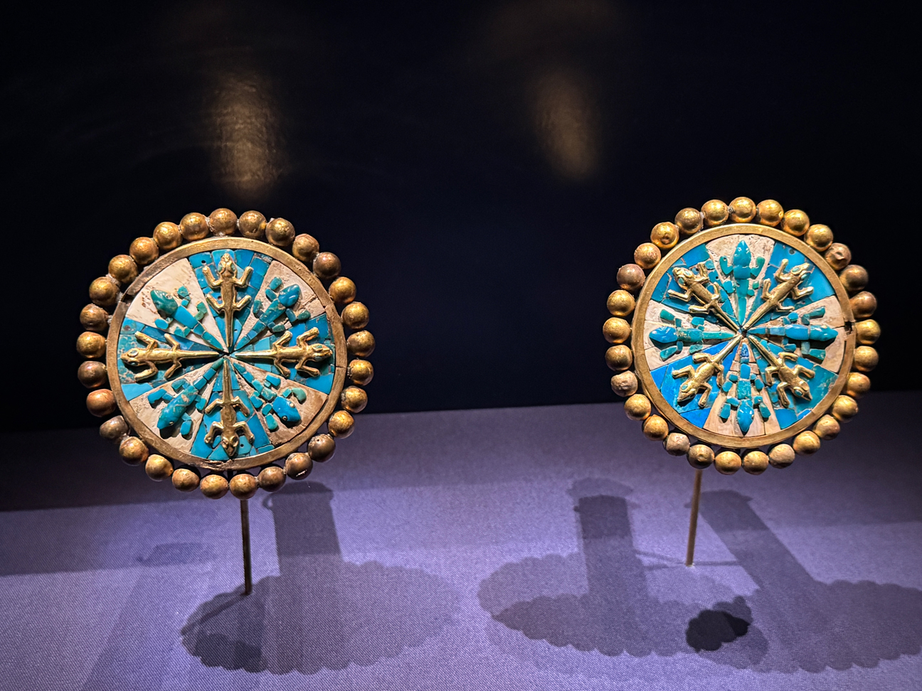 いろんなモチーフの土器が続く。右下のは金とターコイズの耳飾り。青と金の対比がきれい。