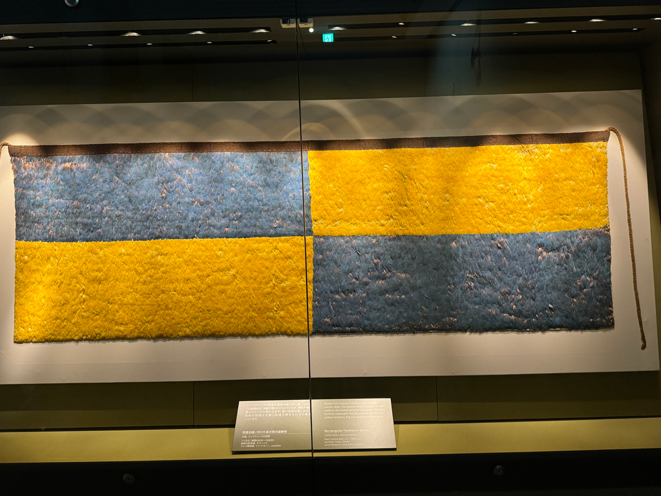 ルリコンゴウインコの羽を織り込んで作られた織物。長さ5メートルほど。
