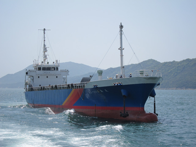 右:こんな貨物船やLPG船が至るところに沖泊めされていて、その間を縫うようにフェリーは航行する。かなり楽しい、
