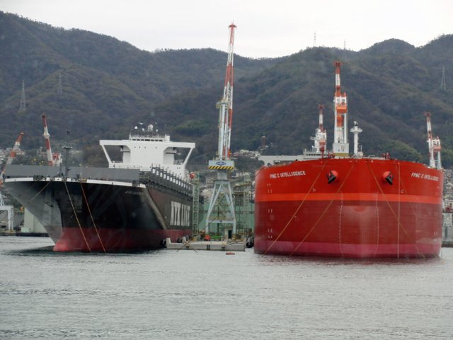 船体の白っぽいのは海面の反射ではなく、全部汚れ。