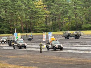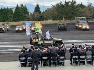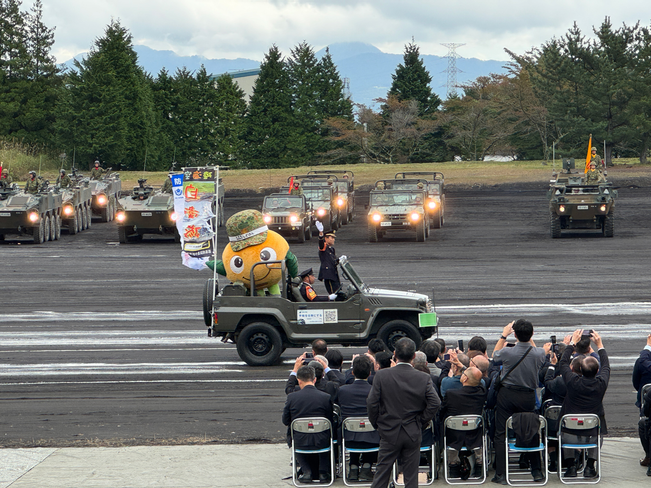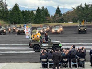 この後順次グラウンドの左側へ移動し、行進開始……なのだが、先頭を飾ったのはジープに乗せられた静岡地本のマスコット着ぐるみだった。