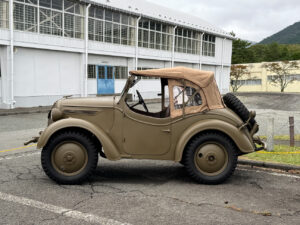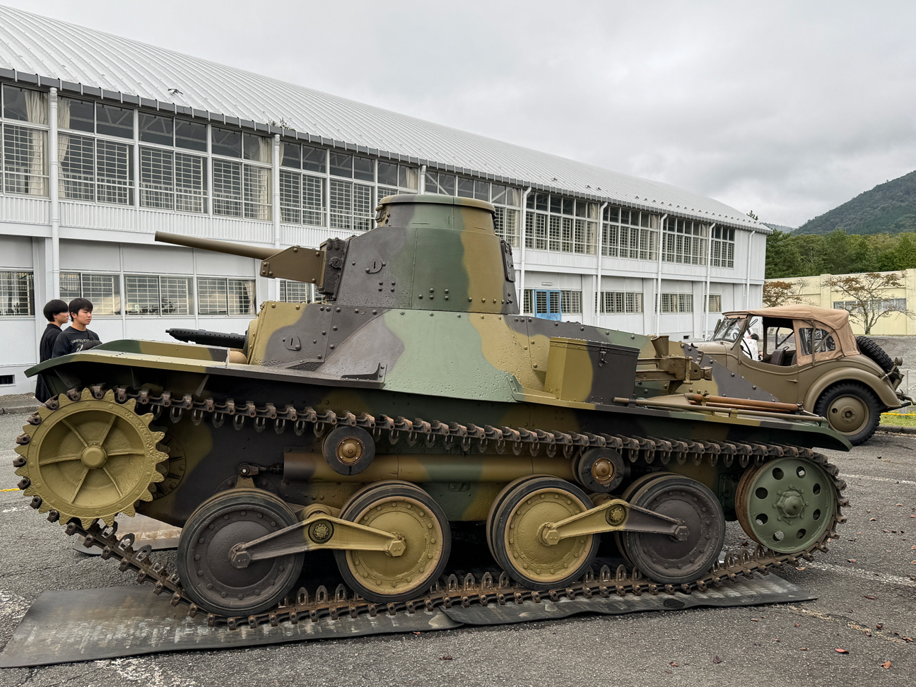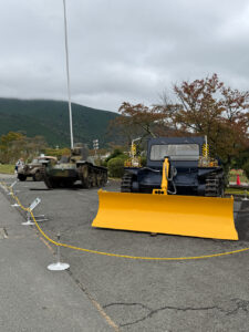 手前から、九五式軽戦車を戦後改造してブルドーザにした「八号ブル」、九五式軽戦車、戦前の軍用小型乗用車「くろがね四起」。