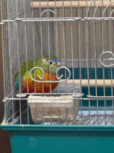 お腹がすくとエサ入れまでやってきて飲み食いし、その後楽な姿勢が取れる所に戻って羽繕いなどして過ごしている。そしておやつの時間になると、またちゃんともらえる場所に出てきて待っている。