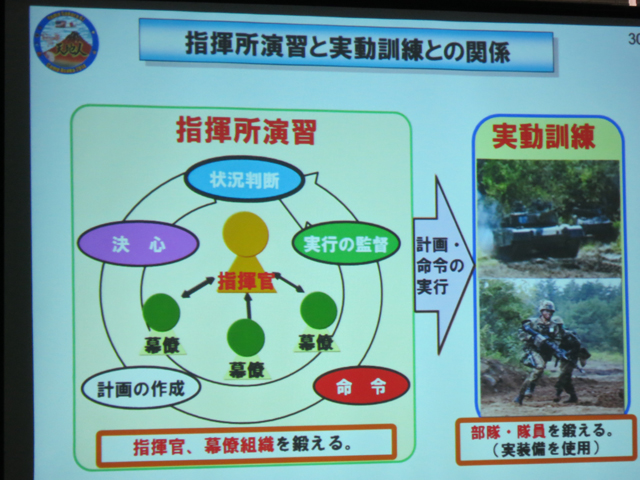 これは日本が他国から侵略された時、米陸軍と協力して具体的にどう動くかをシミュレーションする訓練。朝霞では毎年JXRという大地震に備えた指揮統制のシミュレーション訓練をやっているのだけど、それを大規模にして米陸軍を入れて純軍事的にしたもの。「言ってみれば『大戦略』です」という大変分かりやすい説明が中の人からあった。