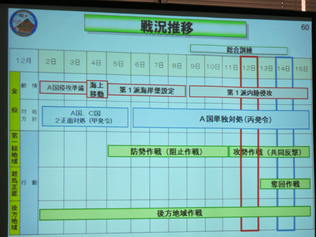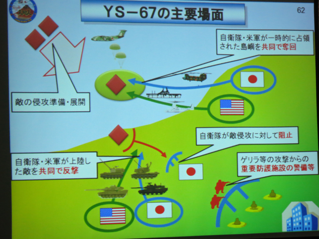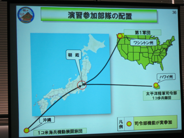 今回の想定は、新潟沖の架空の油田の権益確保を狙って某国軍が日本海側から襲来。佐渡島と新潟、長野の一部に上陸したので自衛隊が食い止め、さらに米軍が共同して反撃、本土からたたき出した後佐渡島を奪回するという想定。
