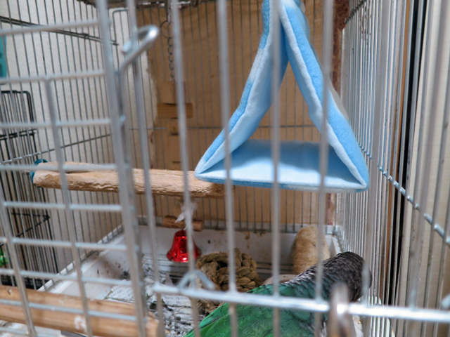 中のカゴは果たして必要なのかと思わないでもないが、プラケース内に直接止まり木をつける方法を思いつかなかったのだ。