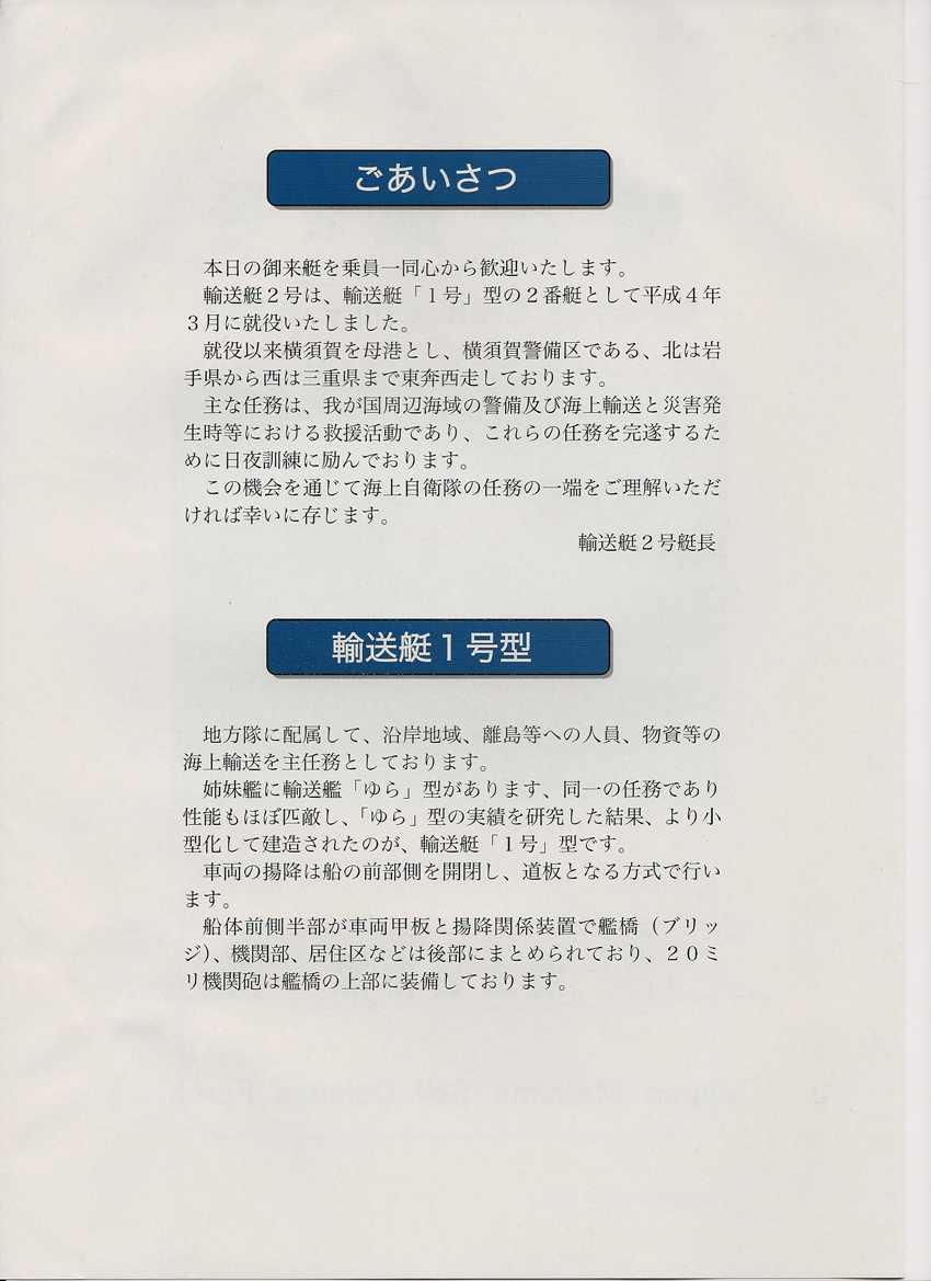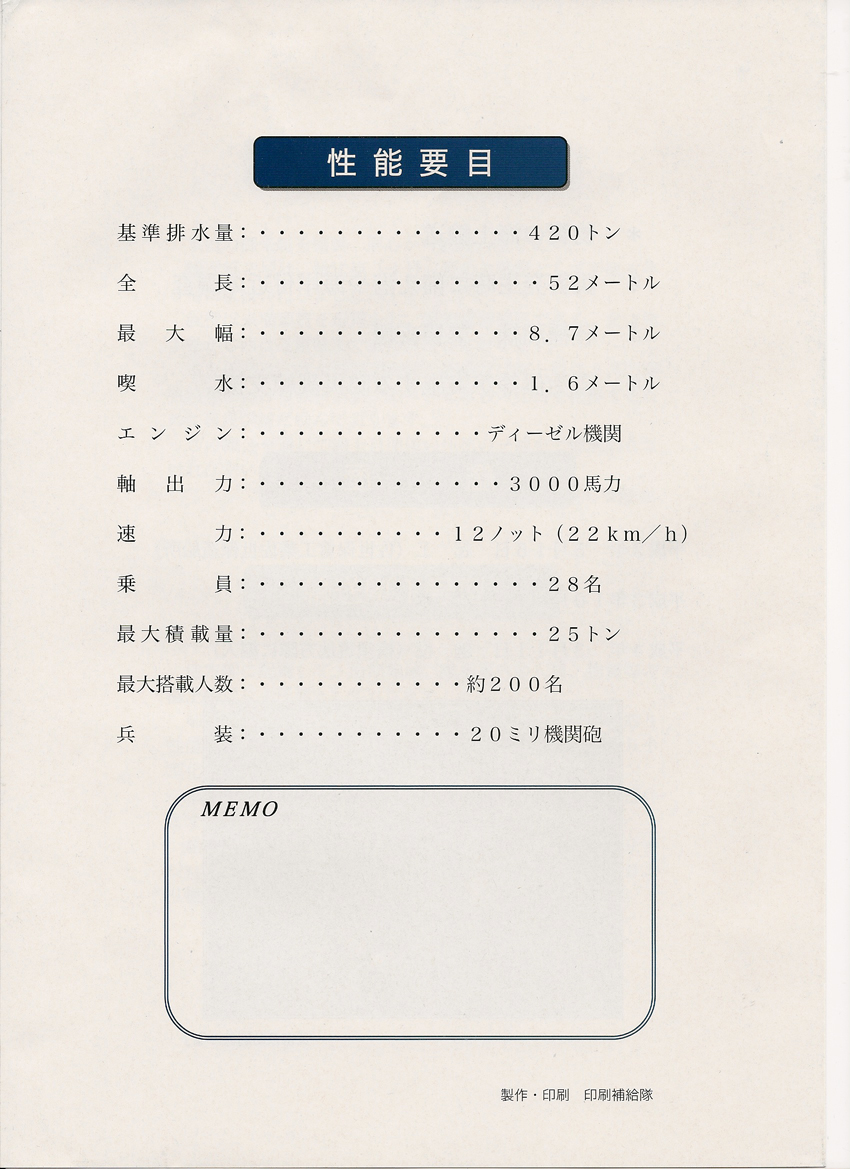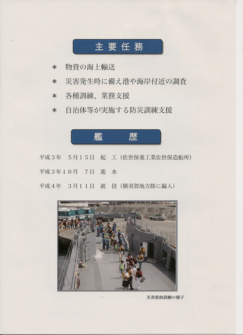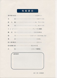 パンフはやや薄めの紙でA4見開き。変に装飾に凝らず必要最小限の内容にとどめているのがすっきりした印象になっている。こんなちっちゃい補助艦艇ですらパンフをちゃんと持ってるのに『きりしま』ときたら……。