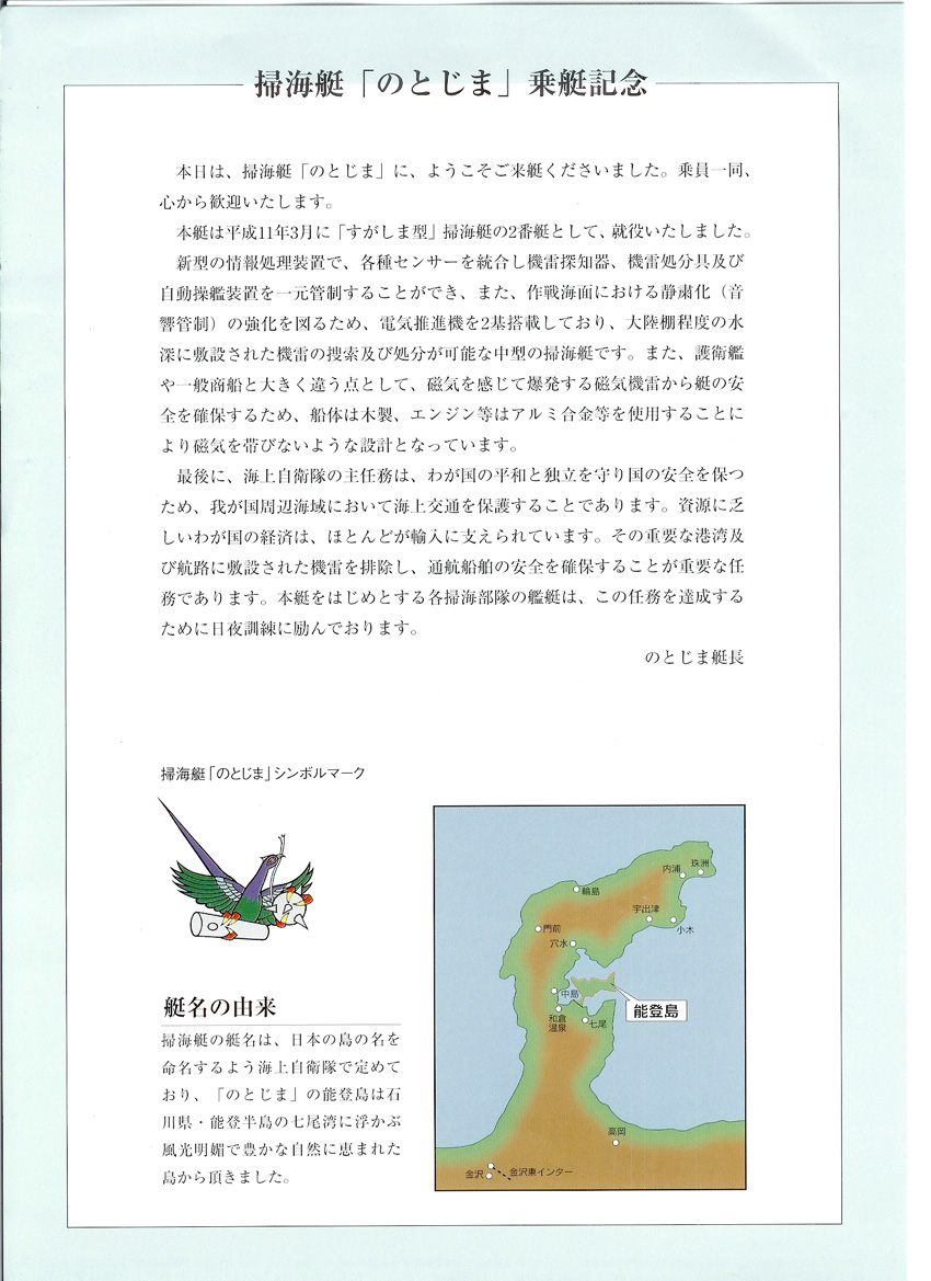無難な作りでコメントしにくいが読みやすいパンフはA4フルカラー。シンボルマークが機雷をつかんだ雉だが、命名の由来となった石川県能登島の名物なのだろうか?